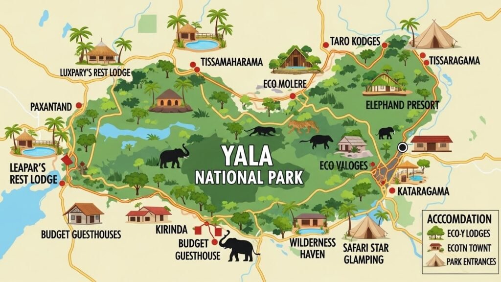Choosing where to stay can significantly impact your Yala National Park experience. The right accommodation balances proximity to the park gates, comfort level, budget, and the type of experience you’re seeking. From basic guesthouses to ultra-luxury tented camps, the Yala region offers options for every traveler. Understanding the Geography Most accommodations cluster around three main areas, each with distinct advantages: Tissamaharama (locally called “Tissa”) is the primary gateway town, located about 5 kilometers from the park’s main entrance. This bustling market town offers the widest range of accommodation, from budget guesthouses to mid-range hotels, plus restaurants, shops, and tour operators. The drive to the park gate takes 10-15 minutes. Kirinda is a small coastal village about 10 kilometers from the main park entrance, offering a quieter, more remote feel with beach access. Several mid-range and luxury properties have established themselves here, appealing to travelers who want to combine safari experiences with seaside relaxation. Palatupana sits directly adjacent to the park boundary, offering the closest possible proximity to Yala. Properties here range from camping sites to exclusive luxury lodges. The major advantage is minimal travel time to the park entrance—some properties are literally steps away from the gates. Budget Accommodations (Under $50 per night) Guesthouses in Tissamaharama Tissa’s backpacker quarter offers dozens of small, family-run guesthouses that provide excellent value for budget-conscious travelers. These typically feature simple, clean rooms with private bathrooms, ceiling fans (air conditioning available for a small supplement), and home-cooked meals. What to expect: Most budget guesthouses are family homes where owners have converted rooms or built small annexes for guests. You’ll experience genuine Sri Lankan hospitality, with hosts often going out of their way to arrange safaris, share local knowledge, and prepare authentic home cooking. Rooms are basic but functional—don’t expect luxury amenities, designer decor, or resort facilities. Typical amenities: Private bathroom with hot water (usually), Wi-Fi (often unreliable), breakfast included, and assistance booking safaris. Many offer lunch packets for full-day safaris and can arrange laundry service. Rooms usually have mosquito nets, essential fans, and basic furniture. Safari arrangements: Budget guesthouses typically work with specific jeep operators and earn commissions on bookings. This doesn’t necessarily mean you’re getting a bad deal—many have long-standing relationships with skilled drivers—but shop around and compare prices. Expect to pay $50-80 for a half-day shared jeep safari or $90-150 for a private jeep. Location considerations: Most budget guesthouses sit within walking distance of Tissa’s lake, shops, and restaurants. The 5-kilometer distance from the park means early morning departures require waking around 5:00-5:15 AM for a 6:00 AM park entry. Best for: Backpackers, solo travelers, budget-conscious families, and those who prioritize spending on safaris over accommodation luxury. Camping Options Several operators offer camping experiences near Yala, ranging from very basic to “glamping” setups. Budget camping typically provides tents, sleeping bags, and shared bathroom facilities. Expect to pay $20-40 per person, including basic meals. What to expect: True budget camping is rustic—you’re sleeping in tents, sharing basic toilet and shower facilities, and eating simple meals cooked over campfires. It’s an adventure-oriented option best suited to young travelers or those comfortable with minimal comforts. Important considerations: Camping near Yala means camping in wildlife territory. Proper camps have safety measures in place, but you might hear elephants at night, and bathroom trips after dark require escorts. It’s thrilling but not for everyone. Mid-Range Accommodations ($50-150 per night) This category offers the best value for most travelers, combining comfort, amenities, and reasonable proximity to the park. Hotel Options in Tissamaharama Several established hotels in Tissa provide comfortable, reliable stays with more amenities than guesthouses but without luxury price tags. These properties typically feature swimming pools, restaurants, air-conditioned rooms, and professional service. What to expect: Clean, spacious rooms with modern bathrooms, air conditioning, comfortable beds, and functional furniture. Properties in this range often have gardens, swimming pools (essential after dusty safaris), restaurants serving both local and international cuisine, and sometimes small spas offering massages. Typical amenities: Air conditioning, hot water, swimming pool, restaurant and bar, Wi-Fi, room service, laundry service, and in-house safari booking assistance. Some properties have naturalist staff who conduct evening talks about Yala’s wildlife. Safari arrangements: Mid-range hotels usually have established relationships with quality jeep operators but also allow you to book independently if you prefer. Their recommended drivers tend to be experienced, and the vehicles are generally well-maintained. Best for: Couples, families, and travelers who want comfort and amenities without breaking the budget. This category offers the best balance of value, comfort, and convenience. Beach Properties Near Kirinda Several properties along the coast near Kirinda offer the unique combination of safari access and beach relaxation. These tend toward the upper end of mid-range pricing but provide excellent value for travelers wanting variety in their stay. What to expect: Beachfront or near-beach locations, ocean views from some rooms, pools, restaurants, and a more resort-like atmosphere than Tissa accommodations. The coastal setting provides cooling breezes and opportunities for beach walks, though swimming can be challenging due to strong currents. T